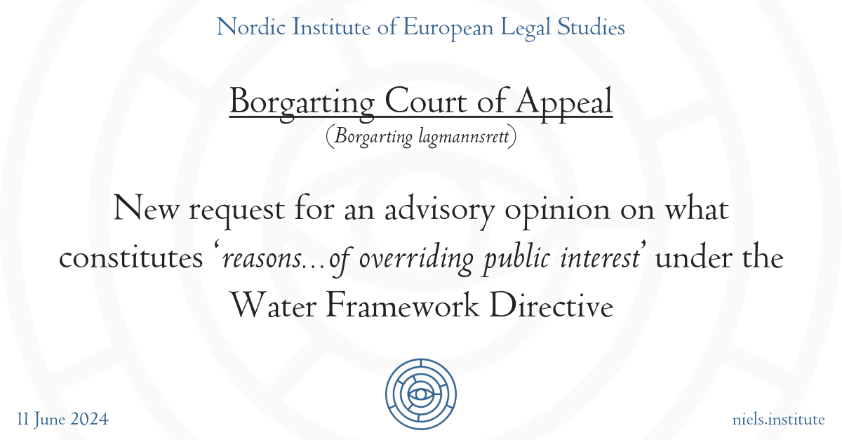 In a new case at the EFTA Court, Case E-13/24, Friends of the Earth Norway and Others v The Norwegian Government, represented by the Ministry of Climate and Environment and the Ministry of Trade, Industry and Fisheries, the Borgarting Court of Appeal (Borgarting lagmannsrett) is asking what constitutes ‘reasons…of overriding public interest’ under Directive 2000/60 establishing a framework for Community action in the field of water policy (the Water Framework Directive).