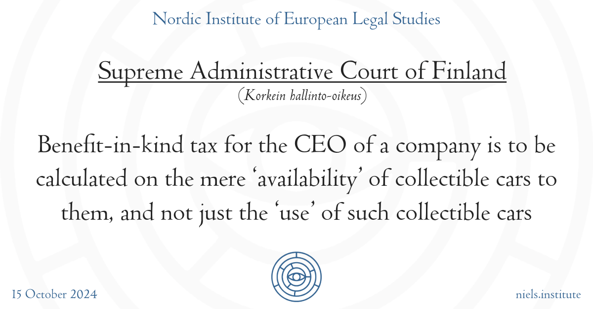 The Supreme Administrative Court of Finland (Korkein hallinto-oikeus) has ruled that the benefit-in-kind tax for the CEO of a company is to be calculated on the mere ‘availability’ of collectible cars to them, and not just the ‘use’ of such collectible cars.